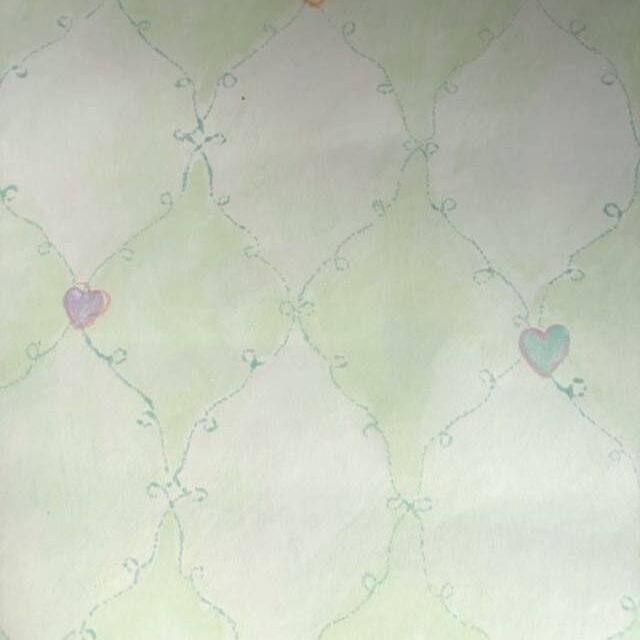 Hearts green white girls vintage wallpaper. A whimsical vintage pattern featuring Mint Green and Off-White diamond shapes with Pink and Blue Hearts. Perfect for a Girl’s Bedroom. The diamond shapes have a hand drawn feel to them–they are not straight edged.